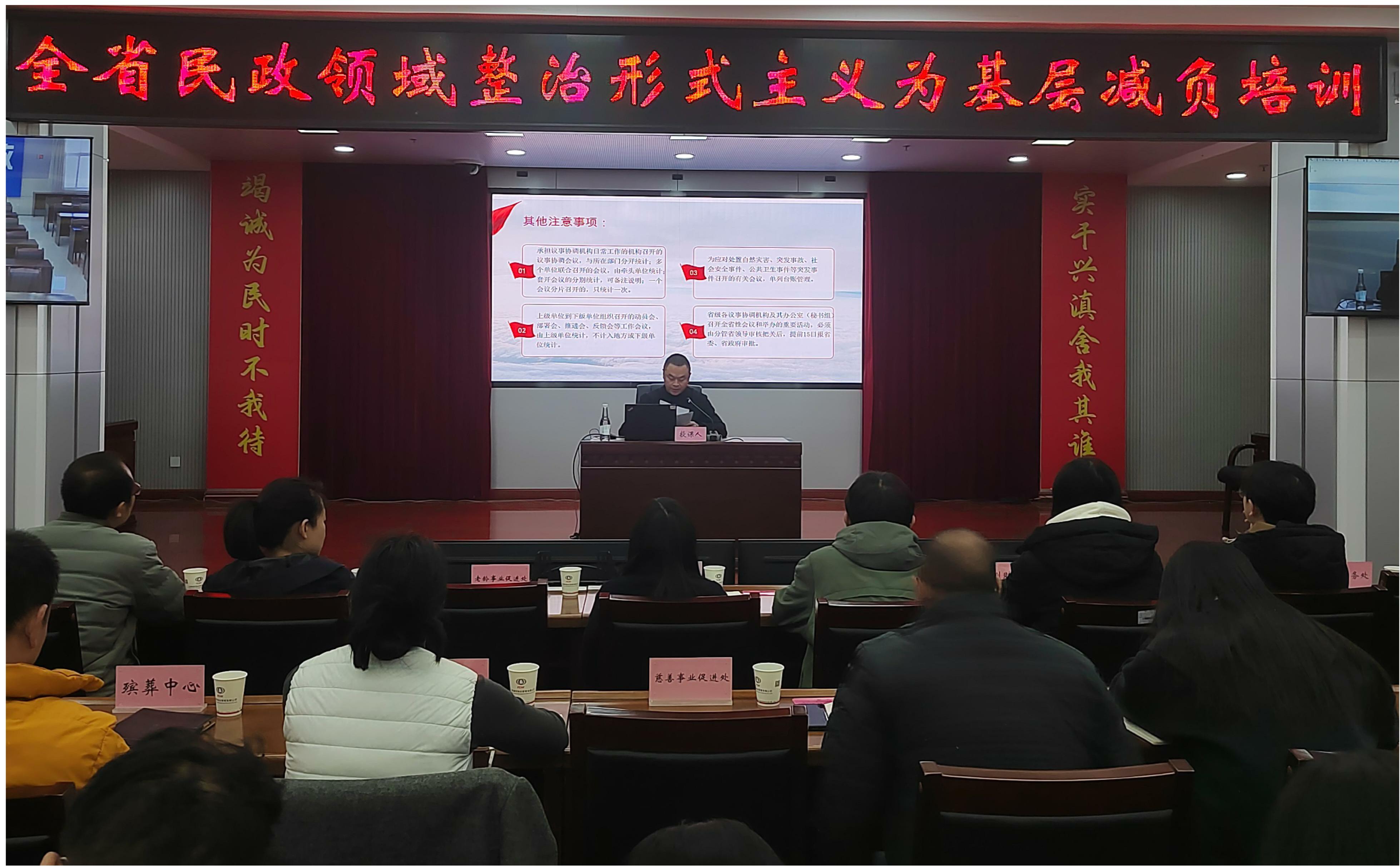 培训围绕《整治形式主义为基层减负若干规定》核心要求,结合我省民政工作实际,从精简文件会议、规范督查检查考核、规范借调人员、整治“指尖上的形式主义”、明晰基层权责等方面,对整治形式主义为基层减负工作有关规定和具体要求进行了系统讲解。
